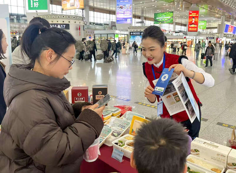 上午,“一碗好饭”特色餐食展示区吸引了众多旅客驻足。各车站立足属地饮食文化,精心呈现了为今年春运全新升级的冷热链餐食:上海虹桥站的上海油爆虾套餐与家常大排咸肉菜饭套餐,南京南站的金陵盐水鸭套餐,杭州东站的南乳东坡肉套餐,合肥南站的刀板香鱼丸套餐,徐州东站的地锅鸡套餐、把子肉套餐等,呈现了长三角地区丰富多元的饮食文化。